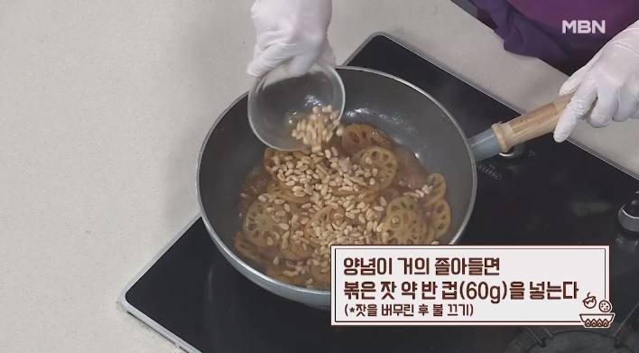 8. 양념이 거의 졸아들었다면, 연근조림의 맛을 한층 더해줄 볶은 잣 약 60g을 넣고 잘 섞어주세요. 여기서 중요한 점은, 잣을 넣고 나서 바로 불을 꺼야 한다는 것입니다.