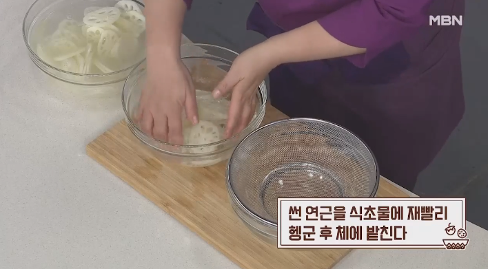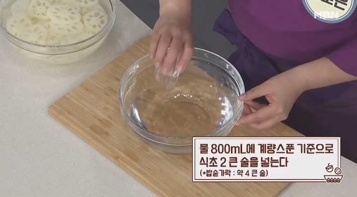 2. 800mL의 물에 식초 4큰술을 넣고, 썰어둔 연근을 빠르게 식초물에 담가 헹군 후, 체에 받쳐 물기를 제거해 주세요.