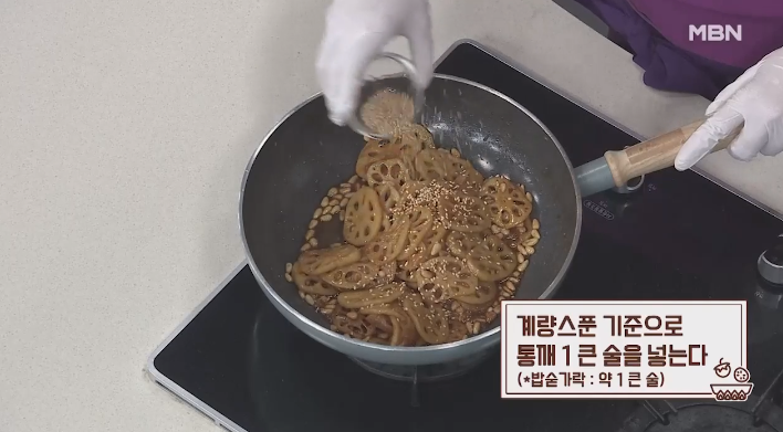 9. 불을 끄고 나서 물엿 3큰술과 통깨 1큰술을 넣고 잘 섞어주면, 이보은의 연근조림 황금레시피가 완성됩니다.