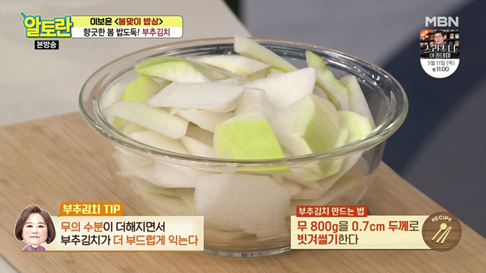 2. 헹군 부추는 체에 올려 물기를 빼고, 이보은샘의 황금레시피에서는 부추와 잘 어울리는 무를 함께 넣어 준비합니다.