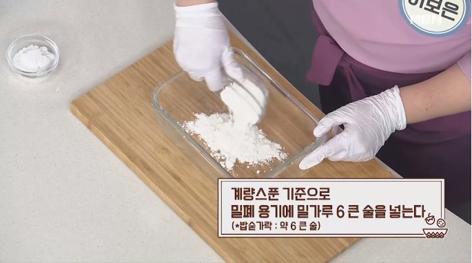 6. 밀폐용기에 밀가루 약 6큰술과 쌀가루 약 3큰술을 넣고 잘 섞어 주세요.