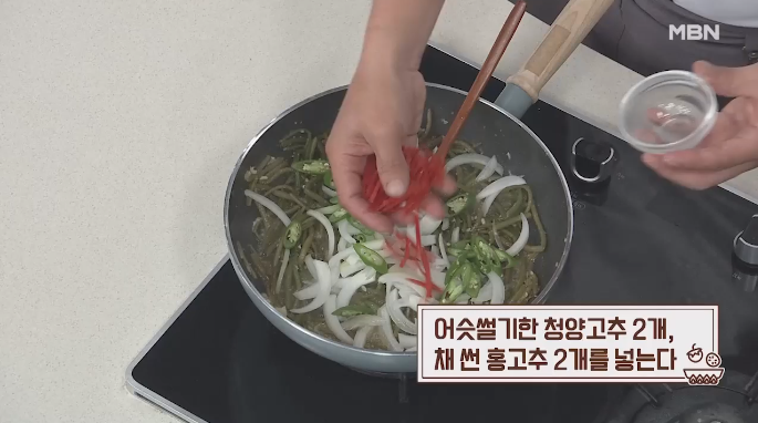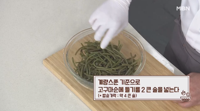 여기서 고구마줄기 볶음 만드는 법의 포인트 하나! 고구마줄기를 볶기 전에 양념을 먼저 버무려 주셔야 한다는 점입니다. 이렇게 해야 고구마줄기 속까지 양념이 잘 배기 때문이라고 해요.