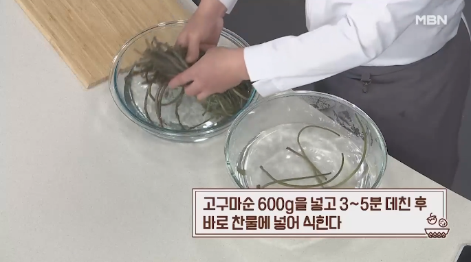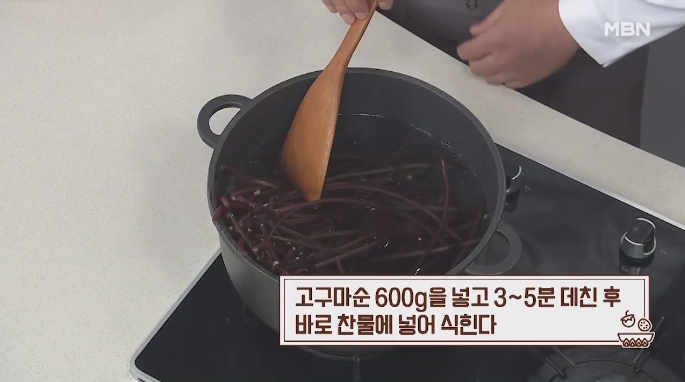 고구마줄기는 데친 뒤 바로 건져서 찬물에 넣어 식혀 주셔야 합니다.