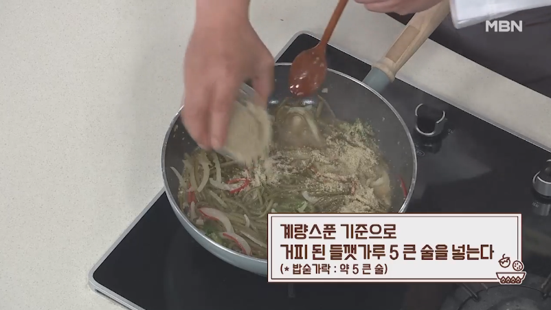 6. 고구마줄기 볶음 만드는 법 두 번째 포인트! 바로 껍질 벗긴 들깻가루 5큰술을 넣는 것입니다. 들깻가루를 넣는 이유는 고구마줄기의 수분을 흡수해 양념 맛을 더 좋게 만들어 주기 때문이라고 해요.