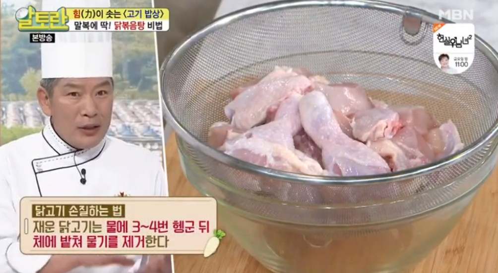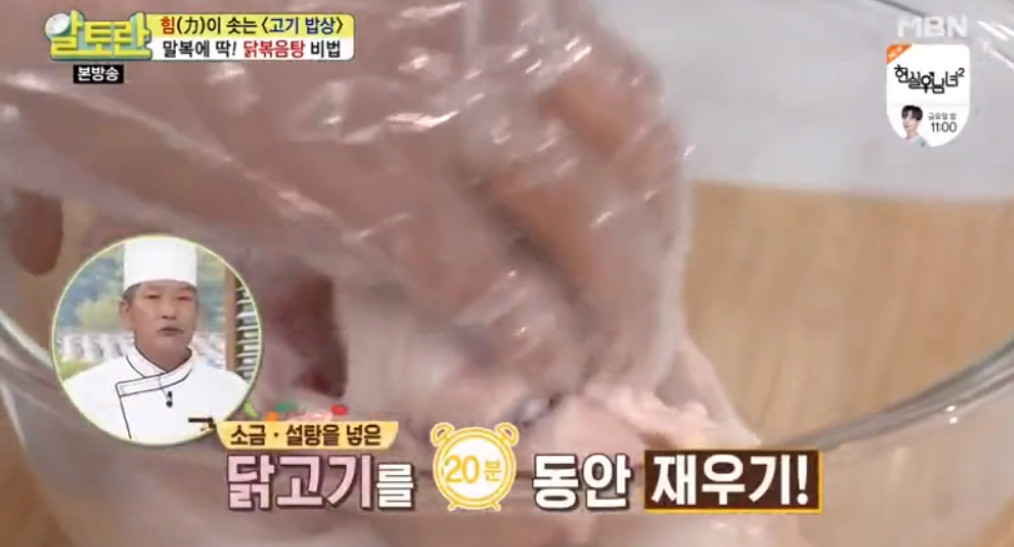먼저 닭고기의 잡내를 제거하기 위해 닭볶음탕용 닭 1kg을 소금과 설탕에 20분 정도 재워주셔야 합니다. 이렇게 물을 사용하지 않고 소금과 설탕만으로 재우면, 닭고기 표면의 이물질이 제거되고 간도 잘 배인다고 해요. 특히 설탕을 사용하면 재우는 시간을 단축하는 데에도 도움이 된다고 합니다. 20분이 지나면 닭고기를 물에 3~4번 헹군 후, 체에 밭쳐 물기를 제거해 주세요.