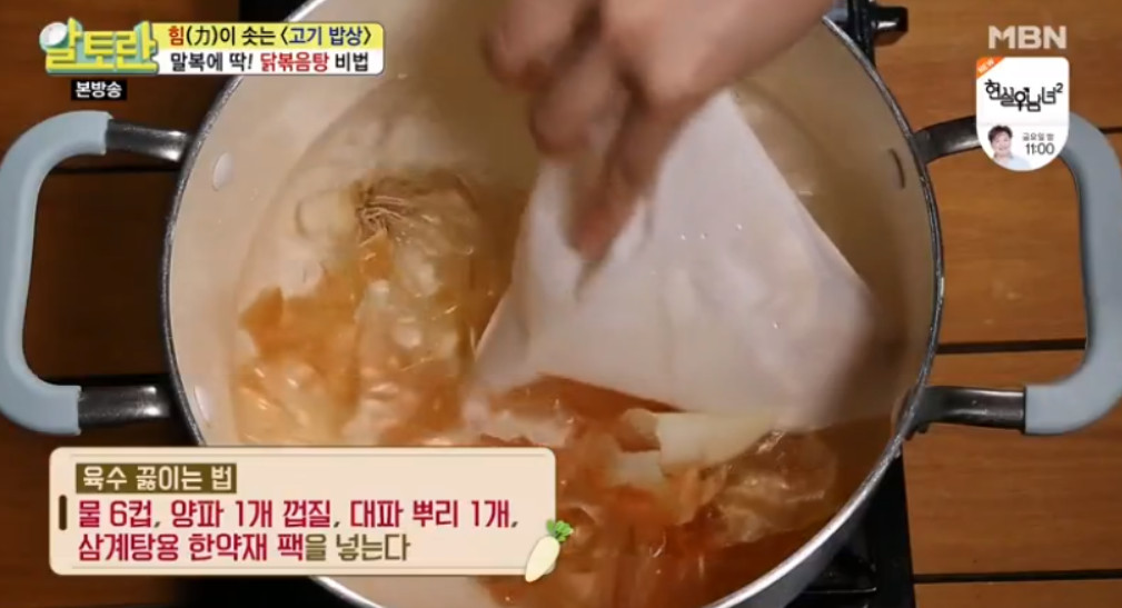 다음은 닭볶음탕의 비린내를 잡아주는 비법 육수를 끓일 차례입니다. 냄비에 물 6컵, 양파 1개의 껍질, 대파 뿌리 1개, 삼계탕용 한약재 팩을 넣고 센 불에서 끓이다가 물이 끓어오르면 약불로 줄여 15분간 더 끓여줍니다. 이렇게 하면 닭볶음탕용 육수가 완성됩니다.