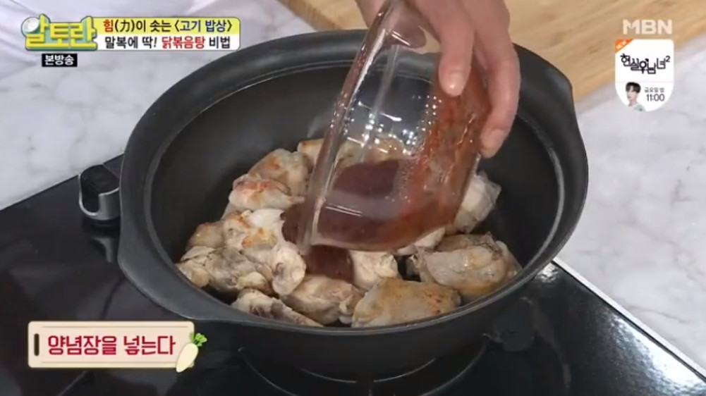 이제 본격적으로 닭볶음탕을 끓일 차례입니다. 먼저 볶아둔 닭고기를 전골냄비에 넣고, 준비해둔 양념장을 부어주세요.