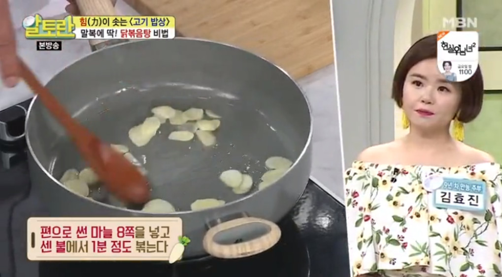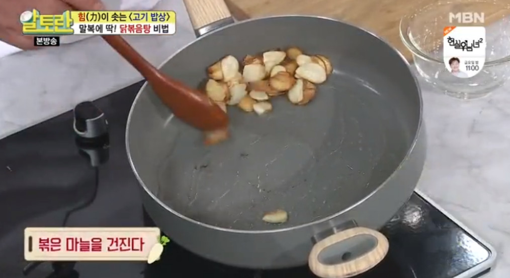 이제 식용유를 두른 프라이팬에 편으로 썬 마늘 8쪽을 넣고 센 불에서 1분 정도 볶아주세요. 이렇게 마늘을 볶아 나온 기름에 닭고기를 볶으면 잡내를 제거하고 닭의 기름도 줄일 수 있다고 해요.