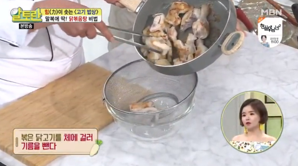 닭고기가 어느 정도 볶아지면 체에 밭쳐 기름을 빼주세요.