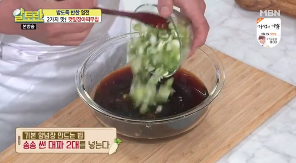 기존에 만든 절임장에 송송 썬 대파 2대를 넣어 주세요.