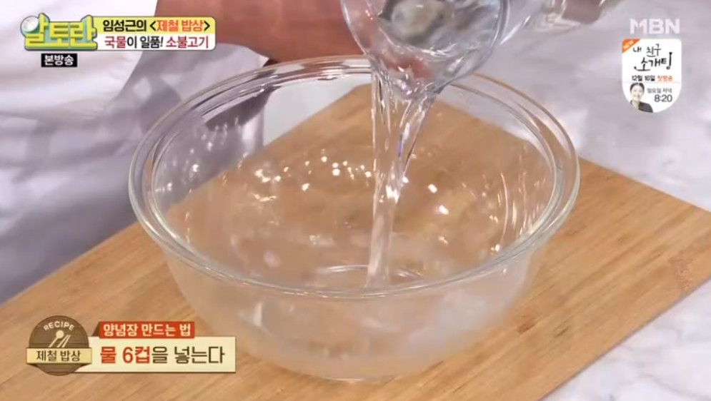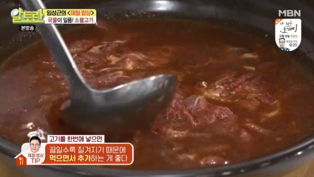 아까 만든 양념장 약 5국자를 넣어 주세요. 소 목심살에는 5국자만 넣고, 나머지 양념장은 육수로 사용할 예정입니다.