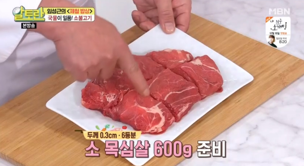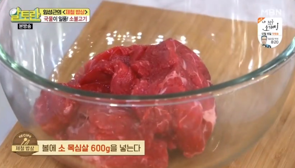 이제 소 목심살에 간을 할 거예요. 볼에 소 목심살 600g을 넣어 주세요.