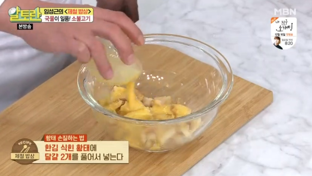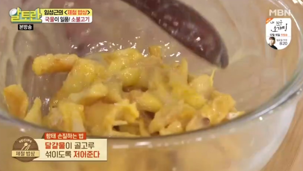 한 김 식힌 황태에 달걀 2개를 풀어 넣어 주세요.