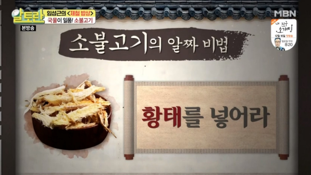 오늘 알려드릴 레시피의 비법을 소개해 드릴게요. 바로 황태를 넣는 것입니다. 밥도둑 소불고기의 핵심은 국물 맛인데요, 황태를 넣으면 시원한 감칠맛이 더해져 국물 맛이 한층 깊어진다고 합니다.