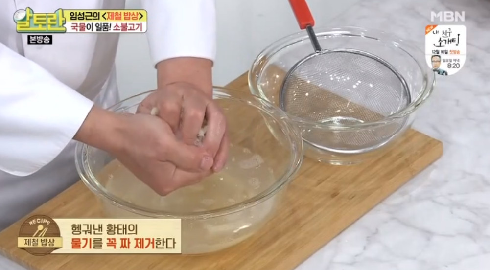 30분이 지나면 황태의 물기를 꼭 짜 주세요. 이렇게 황태를 물에 한 번 헹궈내면 황태의 짠맛과 비린내가 제거된다고 합니다.