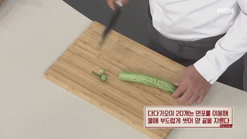 2. 이제 면포로 깨끗이 씻은 다다기오이 20개의 양 끝을 칼로 잘라 통에 담아 주시면 됩니다. 오이 양 끝을 자르는 이유는 이 부분에서 쓴맛이 나기 때문에 꼭지 부분을 잘라야 깔끔한 맛의 오이지가 완성되기 때문이라네요.