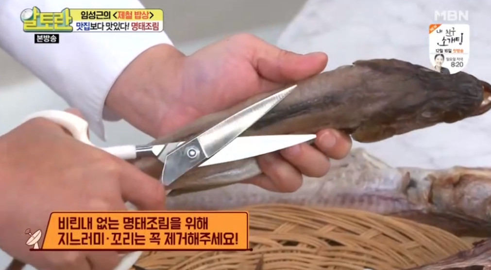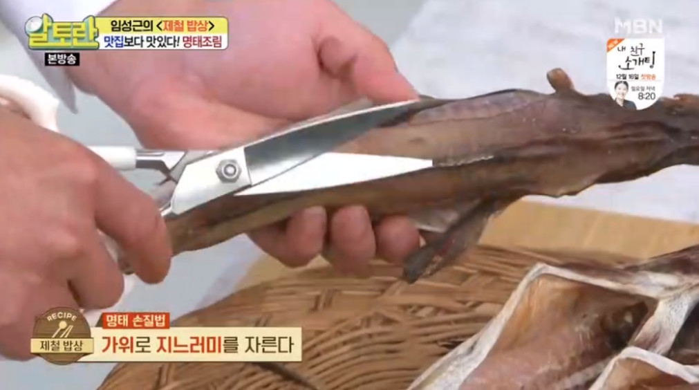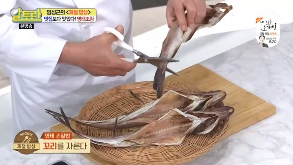 본격적인 요리에 들어가기 전 명태부터 손질해야 합니다. 명태는 가위를 이용해 지느러미와 꼬리 부분을 잘라 주세요. 이렇게 하면 명태를 요리할 때 비린내가 나지 않는다고 합니다.