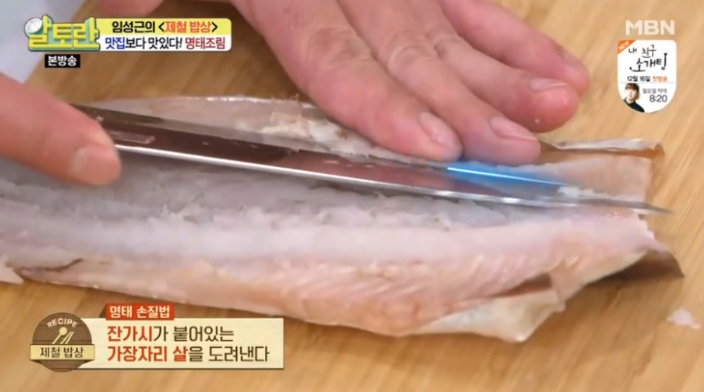 이제 칼을 이용해 머리를 잘라 주시고, 몸통을 반으로 가른 뒤 가운데 큰 뼈와 잔가시가 붙어 있는 가장자리 살을 도려내 주세요.