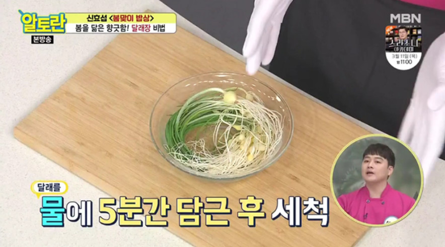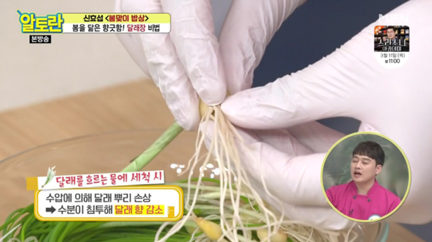 달래를 깨끗이 씻어준 후 도마에 달래를 놓고 칼등으로 달래의 뿌리 부분을 으깨주세요. 이렇게 하면 달래의 향긋한 향을 증폭시킬 수 있다고 해요.