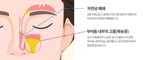 우리가 흔히 축농증이라 부르는 질환의 정확한 명칭은 만성 부비동염입니다. 부비동은 얼굴에 있는 코 주위의 빈 공간을 뜻하는 단어로, 이 부비동에 있는 코 속과 연결되는 작은 구멍을 통해 공기가 통하고 분비물이 배설됩니다. 이러한 부비동에 염증이 생기게 되면, 코 속과 연결되는 작은 구멍이 막혀버려서, 분비물이 밖으로 빠져나가지 못하게 되거나 환기가 되지 않게 됩니다. 이러한 증상이 지속적으로 반복되면 염증이 더욱 심해지고, 급성 부비동염에서 만성 부비동염인 축농증으로 악화되어 축농증 증상이 나타나게 됩니다.