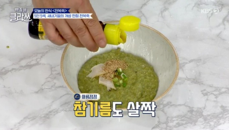 마지막으로 쪽파, 깨소금, 참기름을 살짝 뿌려주면 백종원식 전복죽 완성입니다.