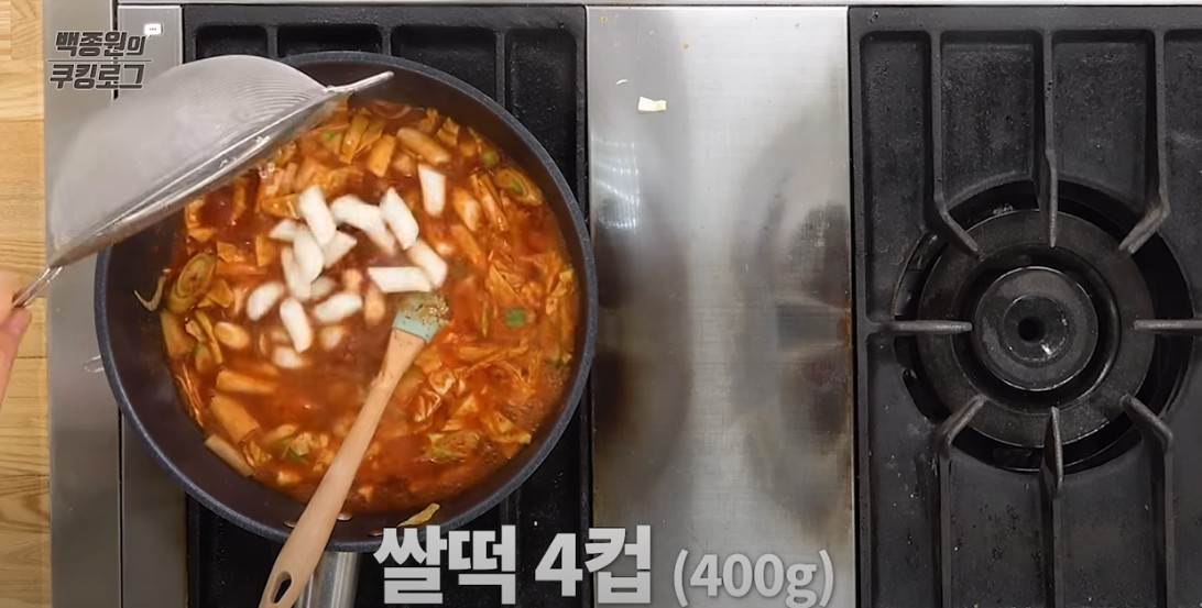 2. 떡볶이에 들어가는 떡은 밀떡, 쌀떡, 떡국떡 중 어느 것을 쓰셔도 무방해요. 밀떡은 떡볶이 양념이 잘 배이고 쫀득한 식감을 원하시면 쌀떡을, 양념맛이 강한 걸 좋아하신다면 떡국떡도 좋습니다. 만약 떡국떡을 사용하실 때는 떡의 양을 조금 더 넣어줘야 한다고 해요. 백종원 선생님은 저처럼 밀떡을 선호하신다고 하네요. 취향껏 원하시는 떡을 넣어주세요.