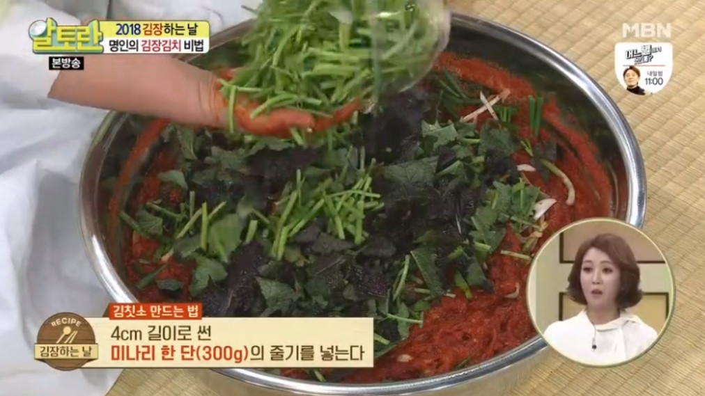 이제 김치소에 부재료를 추가합니다. 4cm 길이로 썬 쪽파 반 단(300g), 어슷하게 썬 대파 흰 부분 1대(100g), 4cm로 자른 홍갓 한 단(300g), 미나리 한 단(300g)의 줄기를 모두 넣습니다.