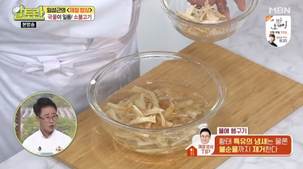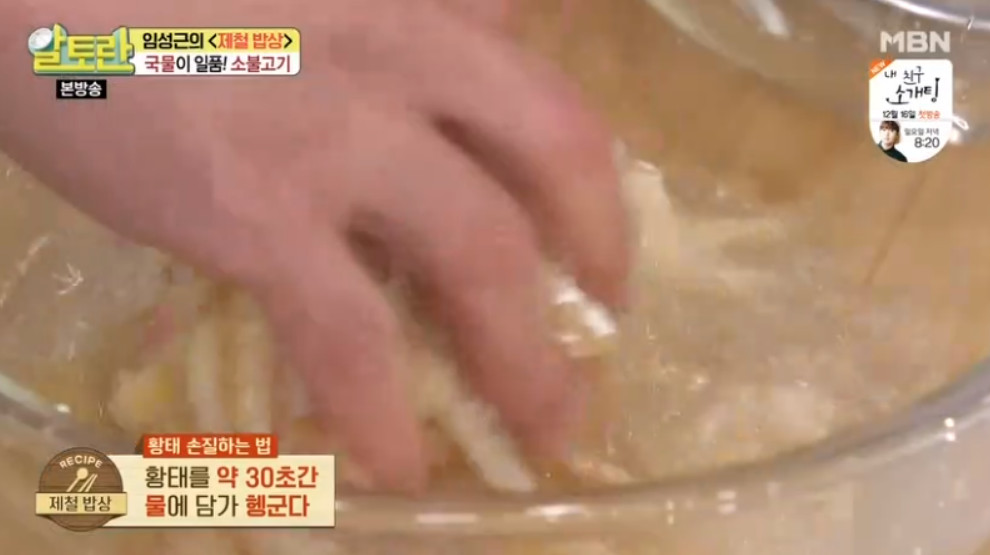 30분이 지나면 황태의 물기를 잘 짜내세요. 이렇게 물에 한 번 헹궈주면 황태의 짠맛과 비린내가 제거된다고 합니다.