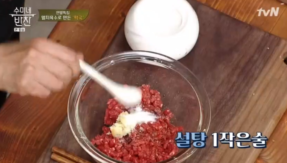 고명으로 사용할 간 소고기 150g에 양조간장 1큰술, 다진 마늘 반 큰술, 설탕 1작은술, 후추를 두 번 뿌려주세요. 그런 다음 손으로 잘 섞어줍니다.