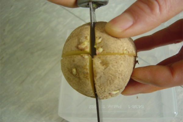 - 절단: 깨끗이 소독한 칼로 감자를 위에서 아래로 향해 절단합니다.