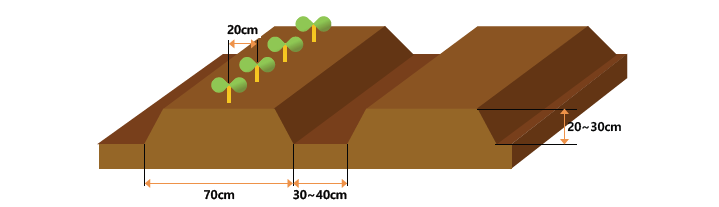 ● 밭 갈기와 이랑 만들기: 봄에 땅이 녹으면 퇴비와 비료를 적당히 뿌려준 후, 밭을 20cm 이상 깊이로 갈고 흙덩이를 부수어 평탄하게 합니다. 감자를 심기 직전에 75~80cm 간격으로 이랑을 만들어 줍니다.