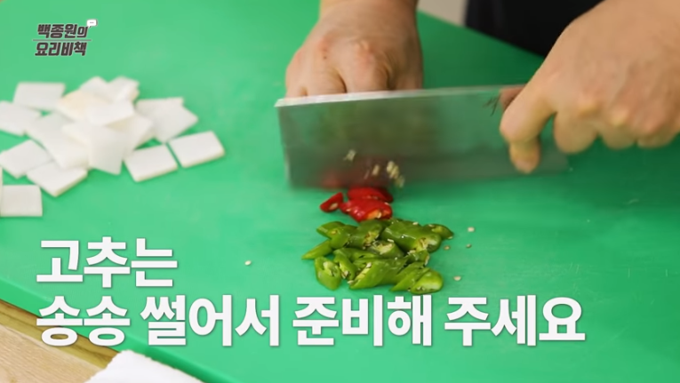 3. 청양고추와 홍고추는 비스듬히 썰고, 대파는 1cm 간격으로 송송 잘라줍니다.