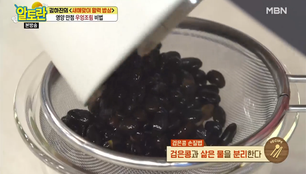 8. 20분이 지나면 검은콩과 삶은 물을 분리합니다. 삶은 물은 잠시 후에 사용할 예정입니다.
