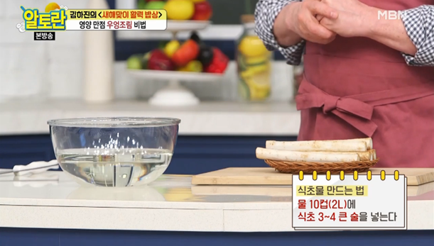 2. 우엉을 손질하기 위해, 물 10컵(2L)에 식초 3~4 큰술을 섞어 식초물을 준비합니다.