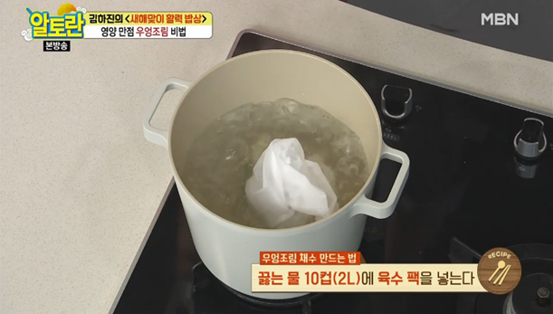 10. 끓는 물 10컵(2L)에 육수팩을 넣고 40분 동안 끓입니다.