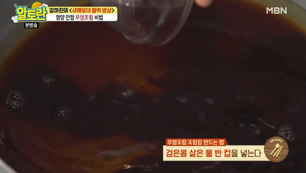 16. 20분이 지나면 삶은 검은콩 1컵을 넣고 물기가 거의 없도록 조립니다.