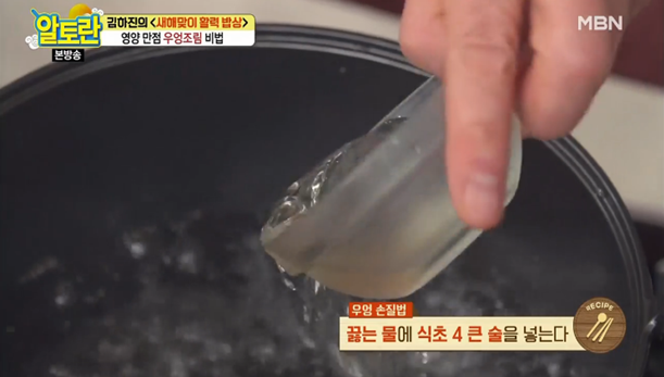4. 끓는 물에 식초 4 큰술을 추가한 후, 미리 담궈둔 우엉을 넣습니다.