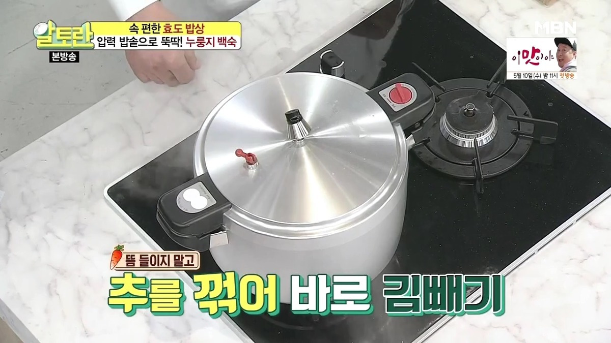 16. 마지막 단계에서는 뜸을 들이지 않고 바로 추를 젖혀서 김을 제거해 주세요. 김이 모두 빠진 후 즉시 뚜껑을 열어주시면 됩니다.