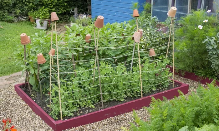 완두콩의 줄기는 덩굴성이 있어 결협기 이후부터 도복이 시작되고, 지면에 닿은 꼬투리가 부패할 위험이 높습니다. 이를 방지하고 햇볕이 잘 들어가도록 지주를 세워 완두콩을 유인해야 합니다. 약 2m 정도의 지주와 끈을 준비하고, 지주를 원줄기 옆에 삼각형 형태로 교차시킨 후 끈으로 고정합니다. 이후 지주에 그물망을 추가하면 완두콩 줄기가 쉽게 올라가 자랄 수 있습니다.