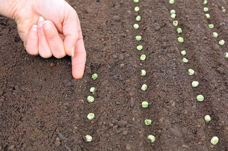 완두콩은 한 구멍에 씨앗을 2~3알 정도 심습니다. 일반적으로 이랑의 너비를 80~90㎝로 설정하고, 두 줄로 심는 방식이 일반적입니다. 각 포기 사이의 간격은 15~20㎝ 정도로 하고, 한 곳에 24개의 종자를 심은 후 3~4㎝ 정도 흙으로 덮어주면 됩니다.