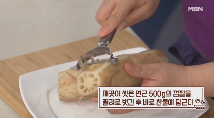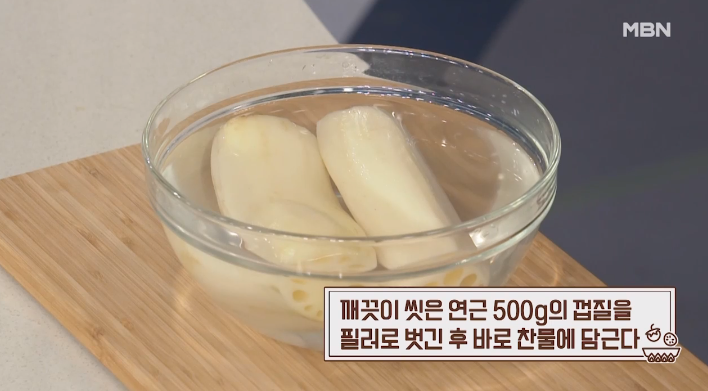 1. 연근을 손질할 때는 먼저 깨끗하게 씻은 500g의 연근을 필러로 껍질을 벗겨줍니다. 이때 중요한 점은 껍질을 벗긴 후 바로 찬물에 담가야 갈변을 방지할 수 있다는 것입니다. 연근을 3-4mm 두께로 썬 후 바로 찬물에 담가 두세요.