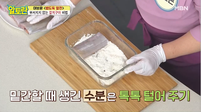 그 후, 갈치의 물기를 제거하고 가루 혼합물에 넣은 뒤 뚜껑을 닫고 잘 흔들어 가루가 고루 묻도록 해주세요.
