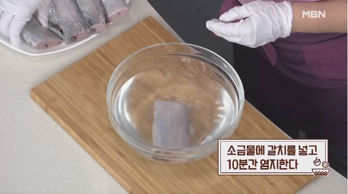갈치구이를 맛있게 만드는 과정에서 식초물을 사용하는 이유는, 염지한 갈치를 식초물에 헹구면 갈치 살에 더욱 탄력이 생기기 때문입니다.