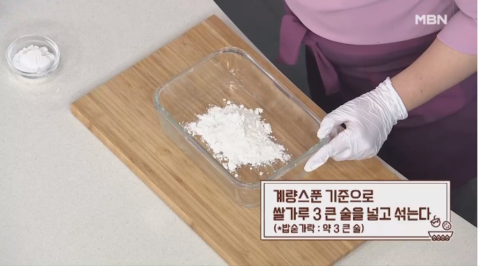 6. 밀폐용기에 밀가루 약 6큰술과 쌀가루 약 3큰술을 넣고 잘 섞어 주세요.