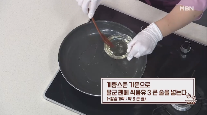 7. 이제 본격적으로 갈치를 구울 차례입니다. 달군 팬에 식용유 약 6큰술을 두르고 갈치를 올린 후, 약한 불에서 천천히 구워 주세요.