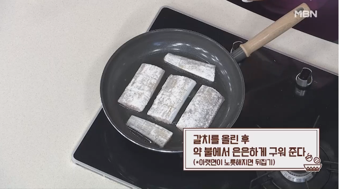 갈치구이는 약한 불에서 천천히 구워야 밀가루옷이 타지 않으면서, 겉은 바삭하고 속은 촉촉하게 익힌다고 합니다.