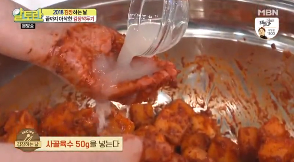 불린 통찹쌀로 쑨 찹쌀풀 100g과 사골육수 50g도 넣어 주세요. 사골육수를 넣는 것은 김치 명인의 비법이니 꼭 한 번 따라해 보시길 바랍니다. 사골육수는 시판되는 것을 사용해도 괜찮다고 합니다.