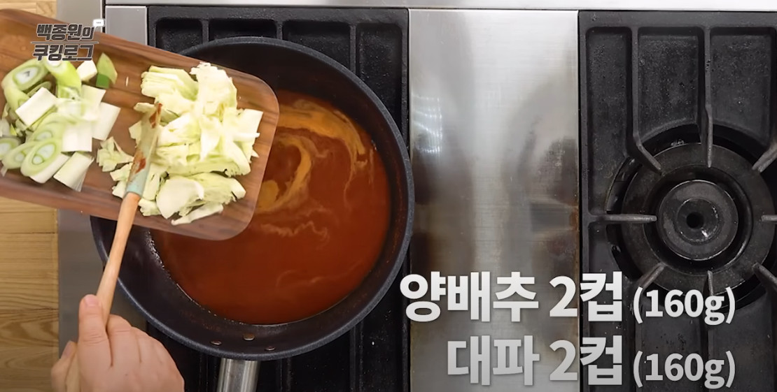 6. 양배추 2컵과 대파 2컵을 넣고 밀떡 또는 쌀떡을 취향껏 선택해서 넣어주세요. 떡을 넣기 전 흐르는 물에 한번 가볍게 씻어서 넣어주시고요, 삶은 달걀도 바로 넣어주세요. 떡볶이의 국물의 맛을 좌우하는 건 고추장이기 때문에 반드시 중국산이 아닌 국산 고추장을 쓰시는 것도 맛의 포인트랍니다.