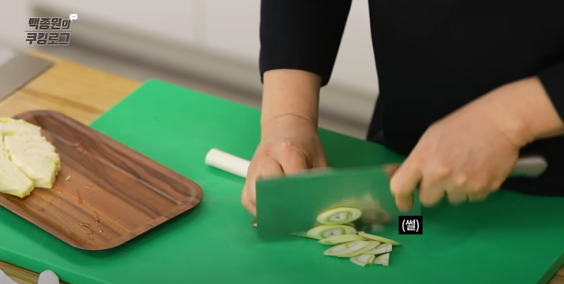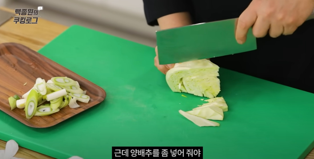 4. 대파는 어슷 썰거나 길게 썰거나 취향껏 자유롭게 썰어주세요. 양배추도 적당한 크기로 썰어주시고, 양파는 넣어도 되고 안 넣어도 된다고 해요. 어묵도 취향껏 원하는 모양으로 썰어요.