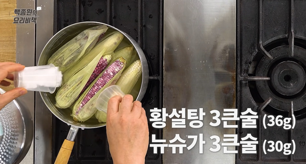 따라서 옥수수를 달콤하고 맛있게 삶고 싶으신 분들은 설탕과 뉴슈가를 함께 사용하는 것을 추천합니다. 양은 각각 반 컵 정도 넣어주시면 되고, 이때 소금도 약간 추가하면 단맛이 더욱 강조된다고 합니다.